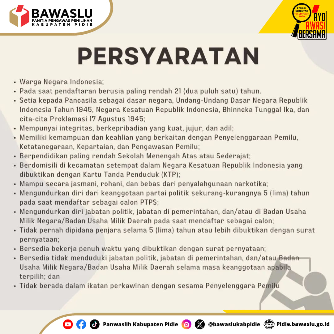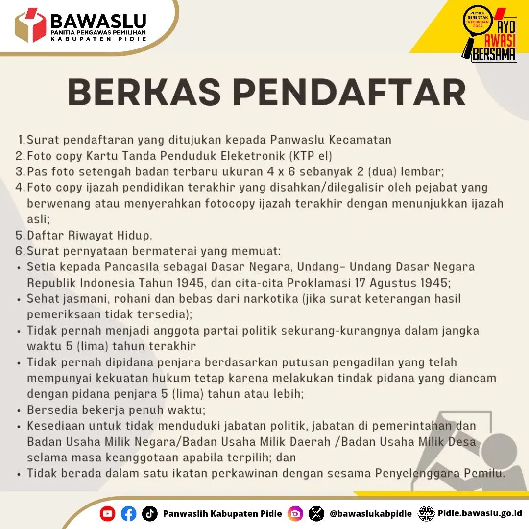 Dalam rangka pembentukan Pengawas TPS (PTPS) Panwaslu Kecamatan Se-Kabupaten Pidie, membuka kesempatan bagi Warga Negara Indonesia yang memenuhi persyaratan untuk mendaftarkan diri sebagai calon anggota Pengawas TPS.