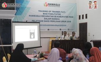 Panitia Pengawas Pemilihan (Panwaslih) Kabupaten Pidie, kembali menyelenggarakan Training of Trainer (TOT) Bagi Fasilitator Panwaslu Kecamatan Se-Kabupaten Pidie Dalam Rangka Pelatihan Saksi Pemilihan Umum 2019, bertempat Di Grand Blang Asan Hotel Sigli.